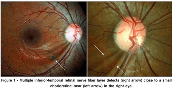 An 18-year-old white man with a previous history of optic nerve glioma in his left eye, treated with chemotherapy four years ago, was referred to the glaucoma sector of the Federal University of São Paulo due to visual field loss in his right eye detected in a routine examination. He also presented type I neurofibromatosis and had been evaluated in the orbit sector. Throughout the entire glioma treatment, the patient did not receive any kind of steroid therapy. During ophthalmologic examination he presented a best corrected visual acuity of 20/20 in his right eye and 20/30 in his left eye. Slit-lamp biomicroscopy was unremarkable. Gonioscopy disclosed a normal open angle and the IOP was 14 mmHg in both eyes. Fundoscopy exam of the right eye revealed a normal and well defined optic nerve head (ONH), with a physiological cup-to-disk ratio. Peripapillary gliosis could be observed in the inferior-nasal aspect of the nerve. Multiple inferior-temporal wedge-shaped defects were observed in the RNFL, one of them close to a small chorioretinal scar (Figure 1). The left eye presented a pale ONH and normal retina.