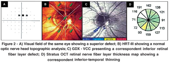 Optic nerve glioma could be another possible explanation for a non-glaucomatous RNFL defect. A tumor that involves the optic chiasm could lead to nerve fiber loss in the fellow eye. More specifically, crossing nasal fibers would be the first affected resulting in a temporal scotoma that would respect the vertical median line. Also, patients with neurofibromatosis can have bilateral optic nerve gliomas(10). They can be diffuse and the total extension can be difficult to determine in the imaging exams. In our case, evaluation with magnetic resonance imaging showed that the tumor did not reach the optic chiasm or the fellow eye. Also our patient did not present a suggestive visual field defect for this condition. Although we believe that optic nerve glioma affecting the right eye is a very unlikely etiology for the localized RNFL defects in our patient, we cannot completely exclude this possibility due to these specific characteristics previously described.