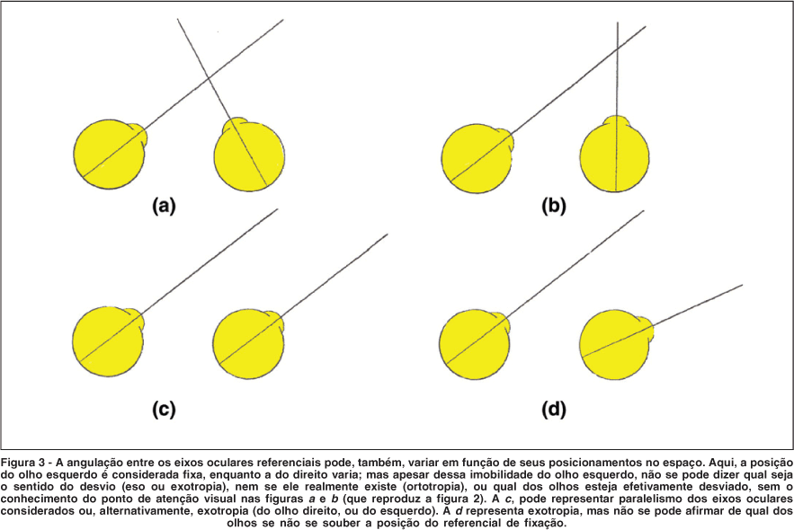 Por essa figura, nota-se que para a mesma relação de direcionamentos (ou "posicionamentos") oculares, várias condições podem ser supostamente verdadeiras, desde esotropias (do olho direito, ou do esquerdo), a exotropias (idem), ou ortotropia. O fator determinante da alternativa correta é, pois, a posição do referencial (o ponto de atenção visual, no caso de consideração dos eixos visuais, ou o ponto de observação, no caso de consideração dos eixos pupilares). Em síntese, o critério preliminar para conhecimento da posição de cada olho é essa referência no espaço. Para a qual se pressupõe que pelo menos um dos olhos esteja alinhado, isto é, com o eixo visual (ou o pupilar) dirigido ao objeto referencial (Figura 3). Em princípio, portanto, sem esses conhecimentos, não é tecnicamente possível dizer que a figura 4 represente uma esotropia do olho esquerdo (a menos que fique implícito que o paciente esteja olhando para o centro da lente da câmara fotográfica), ou do direito (hipótese verdadeira, se se souber que o paciente olha para a direita), nem se pode excluir que se trate de uma posição normal de convergência assimétrica ou, enfim, até mesmo uma de exotropia.
