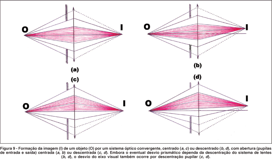Entretanto, a posição espacial do eixo visual, ou pelo menos a de construção de seus componentes, depende do sistema óptico ocular (que gera a imagem foveal do objeto fixado) e de suas relações com o centro de rotação ocular respectivo. Com efeito, um sistema óptico ao ser descentrado altera o posicionamento da imagem de um objeto (Figura 5) e se a descentração ocorrer no olho alterar-se-ão as relações originais dos eixos oculares (geométrico, óptico, pupilar) com o eixo visual, modificando (gerando, ou aumentando, ou diminuindo), por exemplo, um ângulo kappa (Figura 6).