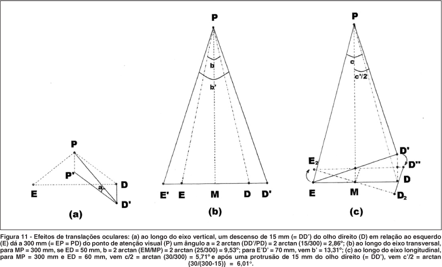 Finalmente, o efeito de translações ao longo dos eixos longitudinais (AP) seria, tão somente, o de produzir rotações levemente assimétricas para objetos simetricamente dispostos relativamente aos olhos (além, obviamente, de alterações fisionômicas e de pequeníssimas mudanças da acomodação). Para uma distância interpupilar de 60 mm, a convergência simétrica a um objeto situado a 30 cm à frente da linha entre os centros de rotações oculares é de 11,42º, mas se um dos olhos sofresse uma protrusão de 15 mm, ela passaria a 11,72º (equivalente à de uma pessoa com separação de 61,58 mm entre os centros de rotações oculares). Essa diferença é praticamente negligenciável, mas, por outro lado, pode-se supor que a assimetria posicional dos olhos produzida por tal translação suscitasse a necessidade de um giro compensatório da cabeça (da linha ED' à E2D", Figura 11 c). Então, a rotação de cabeça (para a direita, para retroceder o olho protruso e avançar o normal, conforme mostra a Figura 11 c), seria igual a arctan (p/i), em que p é a translação ao longo do eixo longitudinal e i a distância interpupilar; no caso, arctan (15/60) = 14,04º: um efeito de cerca de 1º de rotação compensatória da cabeça para cada milímetro de protrusão, ou de retração ocular!
