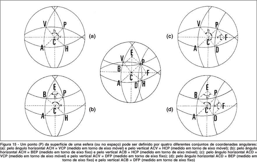 É claro que a partir de um desses sistemas de coordenadas pode-se chegar a outro, por conversibilidade dos respectivos valores. Mas é importante ressaltar que não há o menor sentido em se mencionar "um desvio angular de 15º no plano vertical e de 30º no horizontal" sem que se defina com quais dos critérios essas medidas são definidas. A figura 14 mostra que para coordenadas verticais e horizontais de idênticos valores, quatro diferentes pontos podem ser alcançados, dependendo dos sistemas referenciais escolhidos; ou que, inversamente, um dado ponto na superfície de uma esfera (ou, equivalentemente, no espaço) pode ser representado por quatro diferentes conjuntos de coordenadas angulares (Figura 15).