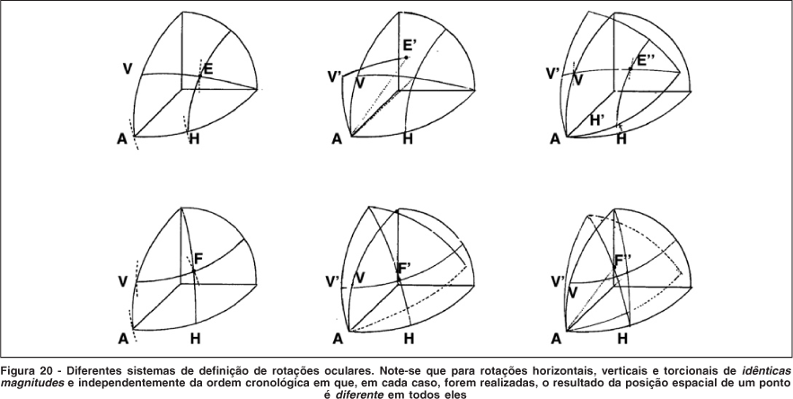 De qualquer modo, as 48 modalidades de consideração resultantes das diversas combinações entre, de um lado, os critérios utilizados para a definição das rotações oculares e coordenadas de suas medidas angulares em cada um dos três planos fundamentais; e, do outro, as formas analíticas de apresentação de suas relações (produtos matriciais, cujos resultados não são comutativos, mas dependentes da ordem desses produtos) (Tabela II), podem ser agrupados em seis sistemas distintos(8) (Tabela III, Figuras 20 e 21).