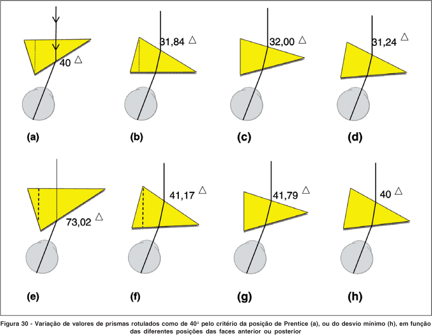 a) Os valores com que os prismas são assinalados dependem de critérios de definição e se aplicam para a respectiva condição específica, isto é, para uma determinada direção de incidência da luz sobre eles; esses critérios podem variar conforme o fabricante (Figura 30, prismas de 40Δ conforme a definição pela chamada posição de Prentice, em "a", ou pela do desvio mínimo, em "h").