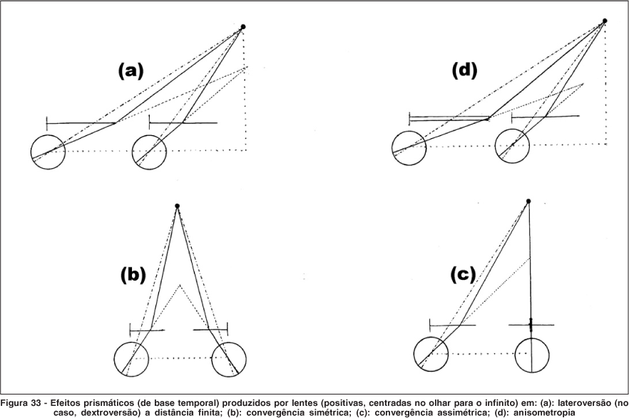 a) Em lateroversões, mesmo quando as lentes forem iguais, por prismações diferentes, pela desigualdade entre as incidências, quando o objeto estiver a distâncias finitas (Figura 33 a), ou em convergências assimétricas (Figura 33 c).