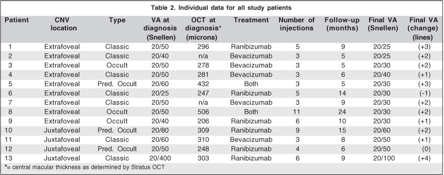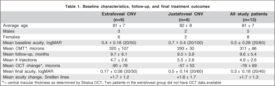 The review resulted in 13 patients who met the criteria, none of whom were excluded. Mean patient age was 81 (±6.8) years (Table 1). Seven patients had classic lesions, three had occult and three predominately occult CNV. Of the 13 patients, nine (69%), had extrafoveal CNVand four, (31%), had juxtafoveal CNV.