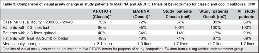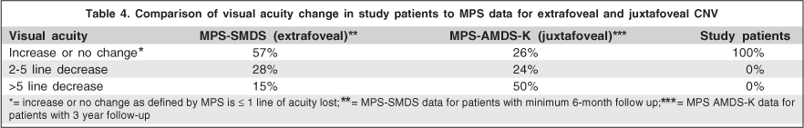The results of this small series of nonsubfoveal CNV in patients with AMD are similar to the visual results of the large MARINA and ANCHOR trials for subfoveal CNV (Table 3). As demonstrated in these trials, both occult and classic neovascularization responded to anti-VEGF therapy in our patients. A slightly greater proportion of our patients had 20/40 or better acuity, probably because there was no subfoveal scarring. We also attempted to compare our results with the MPS studies which used argon laser to treat extrafoveal CNV and krypton red laser to treat juxtafoveal CNV (Table 4). While our results seem favorable, a comparison of different patient groups from different studies and different decades is impossible to interpret in a scientific manner. A prospective, randomized controlled trial is needed to confirm our results.