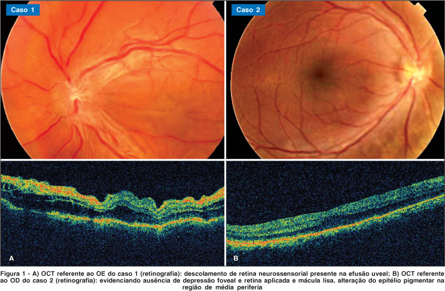 O primeiro caso mostrou o microftalmo associado à síndrome de efusão uveal idiopática. Trata-se de uma rara condição, inicialmente descrita por Schepens e Brockhust(5) em 1963, caracterizada por um descolamento de coróide e retina, secundário ao vazamento de líquido da coriocapilar para o espaço supracoróideo e sub-retiniano(6). Geralmente é bilateral e afeta indivíduos de meia idade portadores de microftalmo.