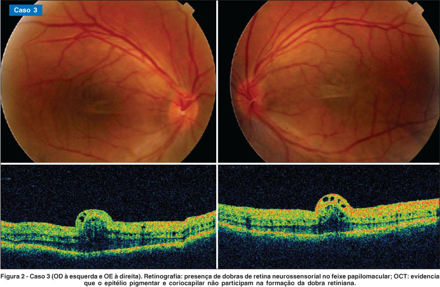 Nesse caso, além da alta hipermetropia, havia a dobra retiniana neurossensorial na fóvea e feixe papilomacular em ambos os olhos. A tomografia de coerência óptica mostrou a característica peculiar de redundância da retina interna sem a participação do epitélio pigmentado retiniano e coriocapilar. Isso ocorre devido ao crescimento independente da retina neurossensorial e do epitélio pigmentado da retina nos estágios de embriogênese, particularmente na região macular. Por tudo isso, a tomografia de coerência óptica revelou ser o exame de excelência para o diagnóstico desta entidade patológica.