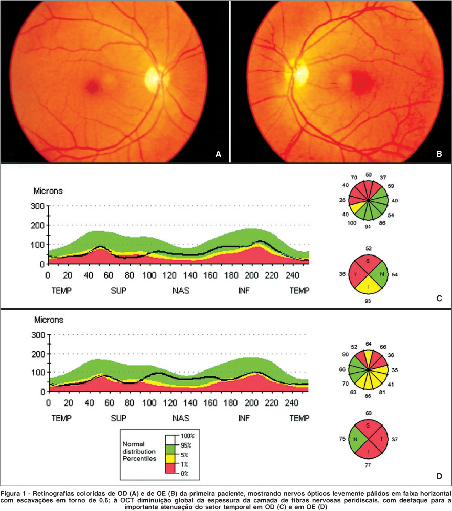 A primeira paciente, M.P.F., feminina, 62 anos, foi encaminhada com a suspeita de GSH e estrabismo de recente instalação. Referia ceratotomia radial prévia. Ao exame, leve paresia do VI par à esquerda, com acuidade visual corrigida de 20/30 e pressão intraocular de 12 mmHg em cada olho. A paquimetria óptica central corneana era de 524/527 micra no olho direito (OD) e no olho esquerdo (OE), respectivamente. À fundoscopia, escavação em torno de 0,6 com leve palidez em faixa horizontal nos discos ópticos bilateralmente. A campimetria visual computadorizada mostrava hemianopsia heterônima bitemporal incompleta superiormente (o laudo falava em escotomas "glaucomatosos" arqueados bilaterais). À OCT, moderada redução difusa da espessura da camada de fibras nervosas peridiscais (NFL) em cada olho, mas com destaque para a perda nos setores temporais - normalmente a soma dos setores temporal + nasal em cada olho fica em torno de 190 +/- 20 micra(6) e neste caso era de 90 e 112 micra em OD e em OE, respectivamente (Figura 1). Encaminhada para propedêutica neurológica, observou-se tumoração periquiasmática, removida cirurgicamente e classificada à histopatologia como um cordoma de clivus.