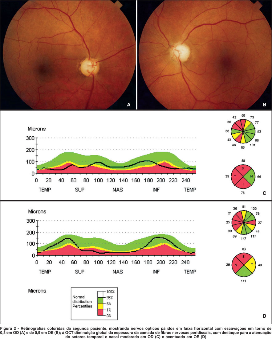 A segunda paciente, R.N.B., feminina, 46 anos, com queixas de baixa visual progressiva, principalmente à esquerda, de lenta evolução, também foi encaminhada com suspeita de GSH para realização de OCT como confirmação diagnóstica. Ao exame, acuidade visual corrigida de 20/30 e de 20/60 em OD e em OE, respectivamente. A pressão intraocular era de 13 mmHg em cada olho, com paquimetria óptica central corneana de 515 micra (OD) e 520 micra (OE). À fundoscopia, palidez importante em ambos os discos ópticos, com hiperpigmentação e alguma atrofia peridiscal (não se podia falar em zonas alfa e beta típicas), mas o que mais chamava a atenção eram amplas escavações cilíndricas em torno de 0,8 em OD e 0,9 em OE. Uma campimetria visual computadorizada trazia o laudo de "compatível com glaucoma avançado", revelando hemianopsia heterônima bitemporal com baixa sensibilidade foveal em OE. À OCT, importante perda difusa da NFL bilateral com maior acometimento dos setores nasais e temporais, que somavam em cada olho 105 micra (OD) e 74 micra (OE) (Figura 2). Com a suspeita de acometimento quiasmático, foi referida para propedêutica neurológica tendo sido identificada importante tumoração periquiasmática com aspectos de um craniofaringeoma. O tumor foi removido cirurgicamente confirmado-se este diagnóstico à histopatologia.