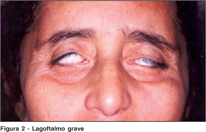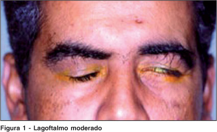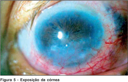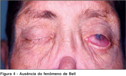 O dano ao VII par craniano (facial) é comum na doença, afetando particularmente os ramos occipitotemporal e zigomático, produzindo paralisia seletiva no músculo orbicular. As fibras mais superficiais dos músculos são as mais comprometidas. Isso acontece em qualquer das formas clínicas da doença, porém é mais comum em associação com lesões tuberculóides da face, especialmente durante reações do tipo I e na forma Virchoviana (LL) não tratada, de longa duração. A invasão bacilar dos músculos superficiais da face pode contribuir para a perda do tônus observado na forma LL, resultando em lagoftalmo (Figuras 1 e 2) com limitação do fechamento das pálpebras com ressecamento da córnea e conjuntiva, torna-as mais susceptíveis aos traumatismos e infecção secundária (Figura 3). Na maioria dos pacientes, o mecanismo de defesa da córnea (fenômeno de Bell), no qual o globo ocular, comumente roda para cima durante o sono ou quando o paciente tenta fechar os olhos, compensa a incapacidade do fechamento das pálpebras (Figura 4). As reações nas lesões tuberculóides da face podem resultar em retração do tarso com instalação de entrópio e triquíase, que na presença de anestesia constituem agravos significativos para a córnea.