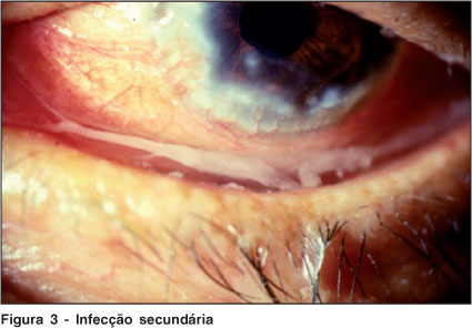 Segundo Choyce(9), a cegueira entre os hansenianos é uma condição multicausal e pode ser determinada pelos seguintes processos, dentre outros. 1. Iridociclite insidiosa crônica devida a destruição do corpo ciliar pelo M. leprae que leva a uma falência progressiva da fisiologia ocular resultando em catarata complicada e phthisis bulbi; 2. Casos negligenciados de lagoftalmo pelo envolvimento do VII par que pode, ou não, estar associado à anestesia da córnea pelo envolvimento do ramo oftálmico do V par. Essa combinação causa exposição da córnea e ceratite neuroparalítica (Figura 5) com risco de perfuração do olho por infecções secundárias; 3. Ceratite hansênica capaz de causar lesões substanciais da córnea com interferência na visão; 4. Em grupo menor a cegueira pode ser devida à iridociclite plástica aguda com ou sem aumento secundário da pressão intraocular, geralmente na vigência de estados reacionais; 5. Em um grupo menor ainda, a cegueira seria causada pela intercorrência de outras doenças como catarata e glaucoma de ângulo aberto.