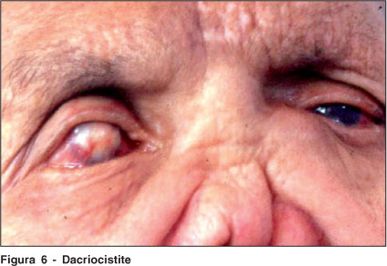 A ulceração da córnea pode inicialmente ser superficial e só detectável com o exame biomicroscópico e, no caso de úlceras anestésicas, pelo lacrimejamento e reação da conjuntiva. As úlceras podem cicatrizar-se produzindo leucoma e desse modo interferindo com a visão. Restos inflamatórios colecionam-se na câmara anterior com formação de precipitados ceráticos, "flare" e células no aquoso, hipópio, com turvação da visão e formação posterior de sinéquias. Descontrolada a infecção invade e cega de forma inexorável (Figura 6). A infecção do saco lacrimal (dacriocistite) é fonte constante de perigo para o olho. Em virtude das lesões nasais da doença, especialmente as periostites e atrofia dos ossos nasais, a obstrução do ducto nasolacrimal pode levar à dacriocistite, considerando a alta intensidade da infecção nasal (Figura 6).