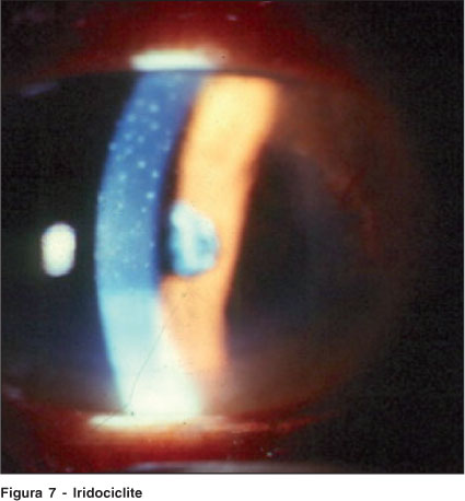 Nas formas multibacilares o olho é invadido pelo bacilo, através da corrente sanguínea, resultando quase sempre no comprometimento bilateral com formação de nódulos conjuntivais e, subsequentemente, comprometimento da córnea e úvea anterior. Os bacilos se multiplicam no corpo ciliar, tornando essa estrutura juntamente com a íris, bastante vulneráveis às reações inflamatórias - iridociclites (Figura 7). Essas complicações são consideradas como a causa mais grave de cegueira entre os hansenianos.