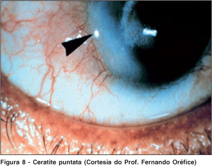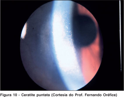 As primeiras manifestações clínicas da invasão bacilar da córnea são as ceratites puntatas (Figura 8): pequenas opacidades esbranquiçadas que podem coalescer comprometendo a transparência da membrana de Bowmann com formação posterior de pannus.