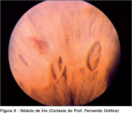 Na íris, a formação de nódulos (Figura 9) pode constituir o único sinal visível da invasão do bacilo no trato uveal indicando o envolvimento de todo o segmento anterior, permanecendo o quadro assintomático até que se instalem estados reacionais.