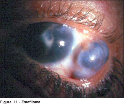 Às vezes a túnica externa constitui sitio de reação ocorrendo hiperemia e dor, visível através da conjuntiva - episclerite. A inflamação crônica do tecido escleral adelgaçado permite a herniação do tecido uveal - estafiloma (Figura 11).