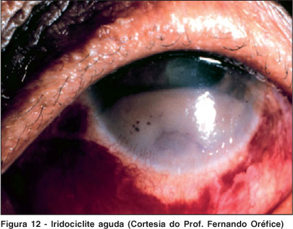 Os tecidos oculares podem ser sítios de reações imunológicas durante a evolução da hanseníase e podem ser lesados na presença ou na ausência de bacilos, especialmente o corpo ciliar e a íris, o que resulta na manifestação que, segundo a maioria dos autores é a mais grave que leva à cegueira - iridociclite aguda (Figura 12). O quadro inclui dor, fotofobia com lacrimejamento, turvação da visão, injeção perilímbica, seclusão pupilar e turvação do aquoso com exsudato inflamatório (células e proteínas) e pode evoluir para formas subagudas ou crônicas.