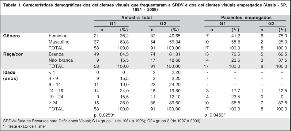A análise dos deficientes visuais empregados mostrou características demográficas semelhantes entre os dois grupos quanto ao gênero, raça/cor, observando-se no entanto maior frequência de pacientes nas faixas etárias acima de 20 anos em ambos. Também houve predomínio de portadores de baixa visão, mas aumentou a porcentagem de cegos em relação à amostra total. Este achado mostra que mesmo pacientes considerados legalmente cegos, quando encontram condições de atendimento oftalmológico e educação adequados podem se inserir no mercado de trabalho.