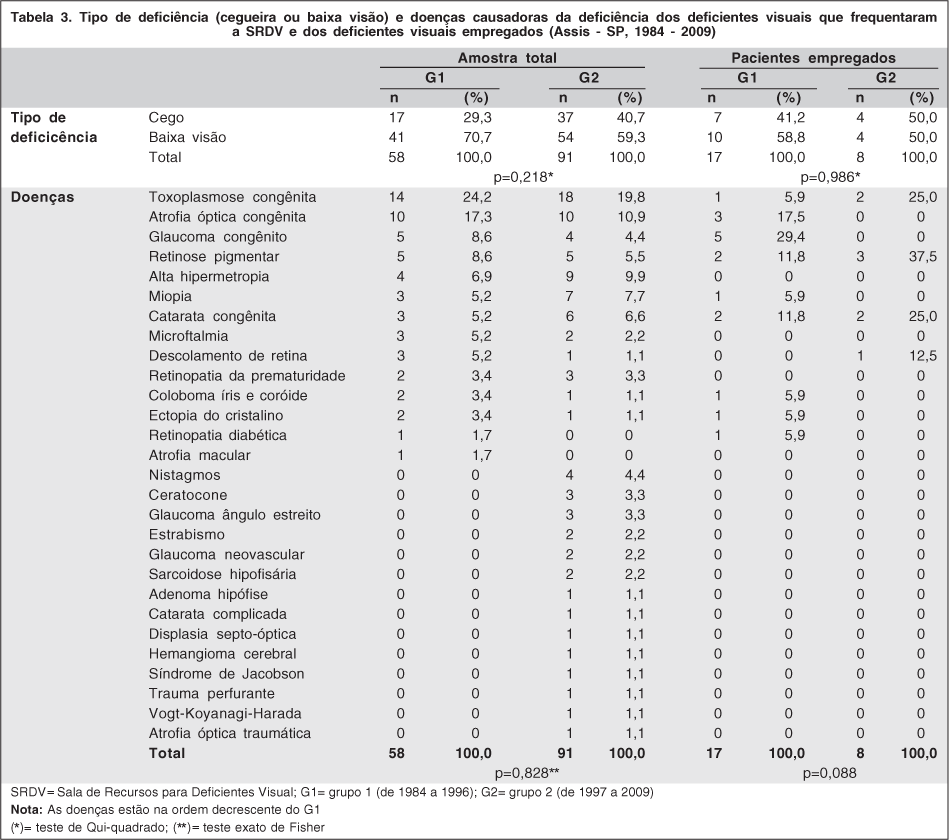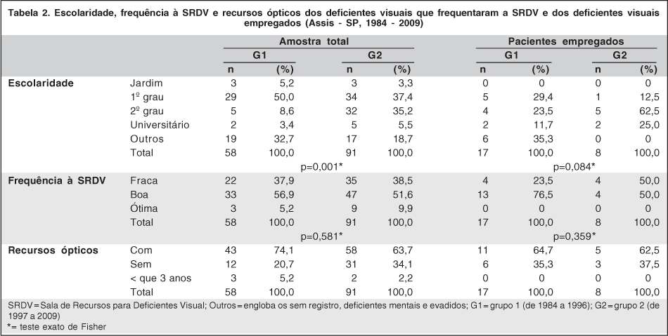 Quanto ao tipo de deficiência visual no G1: 29,3% eram cegos e 70,7% portadores de baixa visão e no G2: 40,7% eram cegos e 59,3% portadores de baixa visão não havendo diferença entre todos os pacientes dos dois grupos (p=0,218) e também entre os pacientes empregados dos dois grupos (p=0,986) (Tabela 3).