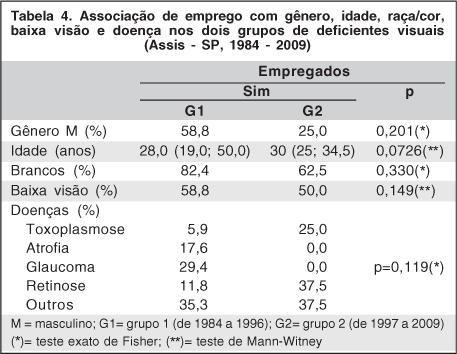 Estavam empregados 17 pacientes em G1 e 8 pacientes em G2 o que representa respectivamente 44,7% e 12,3% dos maiores de 14 anos em ambos os grupos. Não houve diferença para gênero, idade, raça e tipo de deficiência visual entre os dois grupos em relação aos pacientes empregados, mas a mediana da idade foi maior nos pacientes empregados do que nos não empregados.