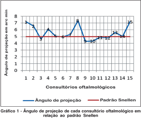 Dentre os melhores pudemos destacar os consultórios 5, 6 e 14. Estes tiveram ângulos de projeção respectivamente a 5,08 minutos de arco, 4,97 minutos de arco e 5,03 minutos de arco, ou seja, muito próximo do ideal. Já entre os piores destacaram-se os consultórios 1, 8 e 15 que obtiveram ângulos de 7,17 minutos de arco, 7,34 minutos de arco e 7,18 minutos de arco respectivamente, ou seja, muito além do que se esperava (Gráfico 1). O que pode ser entendido como uma AV superestimada. Por exemplo, se considerarmos a medida da AV de um paciente no consultório 8, erroneamente estaremos registrando sua visão como 20/20 e, no entanto, esse mesmo paciente não estará apto a ler esta mesma linha em um consultório adequado ao padrão Snellen.