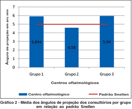 Coletivamente dividimos os 3 centros de oftalmologia para entendermos como eles se comportavam em grupos. No geral o grupo 1 obteve como média dos consultórios um ângulo de 5,894 minutos de arco, enquanto os grupos 2 e 3 obtiveram 4,58 minutos de arco e 5,94 minutos de arco respectivamente (Gráfico 2).