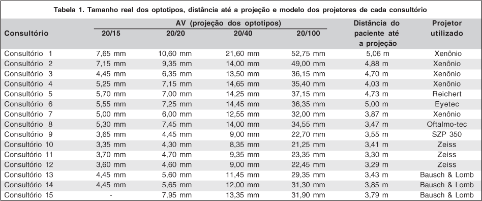 Na sequência todos os consultórios foram visitados e, com o auxílio de uma trena métrica de 7,5 m da marca Feeling e um paquímetro de 150 mm com escala de 0,05 mm da marca Vonder, foi realizada a medida da distância do olho do paciente sentado até a parede de projeção dos optotipos e, ao mesmo tempo, medido o tamanho da letra que era projetada na parede para cada linha de AV de 20/15, 20/20, 20/40 e 20/100. Além disso, levamos em consideração a marca de cada projetor utilizado nos diversos consultórios.