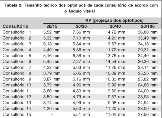 Na sequência, de posse do ângulo real calculado, os valores teóricos para a AV 20/15, 20/20, 20/40 e 20/100 puderam ser determinados com base no ângulo real que cada consultório apresentava (Tabela 3)
