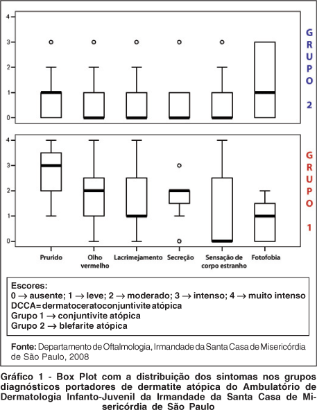 O autor aplicou um protocolo de questões com os seguintes itens: prurido, olho vermelho, lacrimejamento, sensação de corpo estranho, secreção e fotofobia, que foram graduados de 0 (ausência) a 4 (maior intensidade).