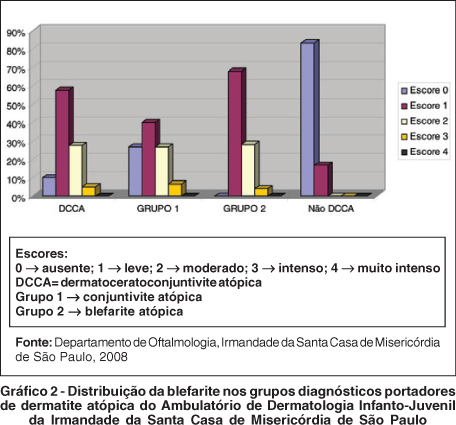 A literatura convenciona como mais frequente a DA em crianças, porém a DCCA é mais encontrada a partir da quarta década de vida, quando a DA começa a diminuir sua frequência(4,9,15-16,21) . No nosso estudo, verificamos alta taxa de DCCA, principalmente casos leves (blefarite atópica). No entanto, encontramos número elevado de pacientes com conjuntivite atópica, se considerarmos que o acometimento se torna mais frequente a partir da vida adulta e a gravidade da doença está relacionada com a cronicidade do processo alérgico.