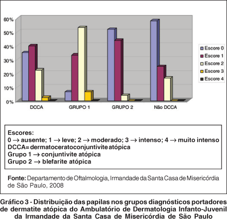 A grande maioria dos pacientes do nosso estudo apresentou achados oftálmicos mais amenos da DCCA, mesmo os que foram classificados no grupo 1. As papilas estavam presentes em todos os casos do mesmo grupo, mas também em boa parte do grupo 2. Sua presença não denotava gravidade do quadro, mas talvez sua intensidade pudesse ser um fator de risco para doença mais intensa, visto que ela foi mais encontrada no grupo conjuntivite atópica (p<0,001).