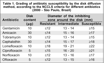 Antibiotic susceptibility was determined for all positive cultures using the Kirby-Bauer disc diffusion method (4, 21-22), with the antibiotic concentration in the disc individually determined for each antibiotic ( Table 1) (4). The reading was performed by measuring the diameter of the growth inhibiting zone around the disk (4), in agreement with the National Committee for Clinical Laboratory Standards (NCCLS) criteria for all antibiotics, with one of three resulting grades: resistant, intermediately sensitive, or susceptible ( Table 1) (4-5, 23).