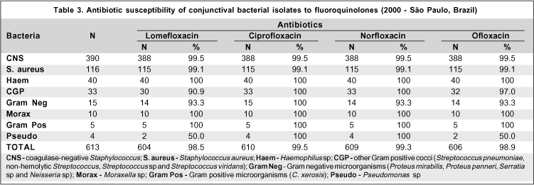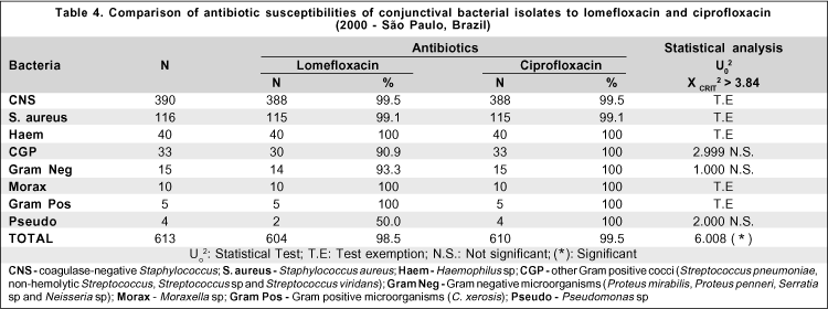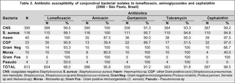 The most frequent infections of the conjunctiva which are submitted to laboratory evaluation are due to bacteria, and an initial treatment with broad- spectrum antibiotics is usually recommended after the clinical diagnosis and after scraping the site of infection (1-3). Susceptibility tests for microorganisms isolated from ocular infections are recommended, since the results are useful not only in specific cases but also as epidemiological data (4-5).