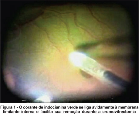 Comercialmente disponível com os nomes: ICG-Pulsion (Pulsion Medical Systems, Munique, Alemanha; 25 mg e 50 mg); ICV Indocianina Verde (Ophthalmos, São Paulo; 10, 25 e 50 mg); Diagnogreen (Daiichi Pharmaceutical, Tóquio, Japão; 25 mgl); e IC-Green (Akorn Inc, Buffalo Grove, Illinois, EUA; 25 mg). A ICG representa o corante mais apropriado para mostrar vasculatura coroidal em exames de contraste. A ICG mostra grande afinidade aos componentes da matriz extracelular da membrana limitante interna (MLI) facilitando sua remoção(3). Cromovitrectomia com ICG ganhou aceitação mundial quando mostrou tornar a cirurgia de buraco macular bem mais facilitada(4). Também permite melhor visibilidade do tecido glial das membranas epirretinianas em vitrectomia para vitreoretinopatia diabética proliferativa e por proliferação vitreorretiniana. A ICG, no entanto, cora melhor a MLI. Outros corantes mostram melhor contraste para a cirurgia de retirada da membrana epirretiniana (MER)(5) (Figura 1).