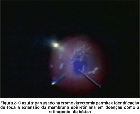 Este corante vital parece atravessar membranas celulares apenas em células mortas tornando-as azuis. Células vivas não são coradas devido aos seus controles de transporte transmembrana que não permitem a ligação do azul tripan (TB). O TB é utilizado de rotina em microscopia para corar sistema reticuloendotelial e túbulos renais. O uso oftalmológico iniciou nos anos 90 quando foi utilizado para corar a cápsula anterior do cristalino facilitando a capsulorrexis na cirurgia de catarata. Logo depois seu uso foi proposto para corar MLI e MER em cromovitrectomia(19). O TB pode não corar tão bem a MLI como a ICG, porém seu uso se mostra mais eficiente na cirurgia de retirada de MER minimizando o trauma à retina durante a cirurgia por permitir a visibilidade de toda a extensão da MER (Figura 2).
