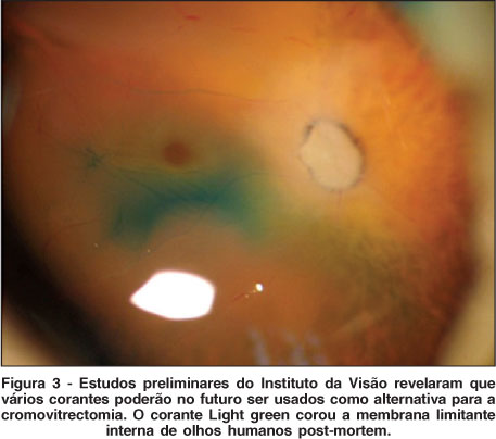 Experimentos recentes propuseram um potencial uso do BrB em cromovitrectomia. Estudos pré-clínicos mostraram que o BrB corou bem a MLI, MER e não causou danos em células retinianas in vitro em concentrações de 0,2 a 0,02%(35). Estudos em roedores e porcos mostraram com concentrações de 0,5% e 0,02% menos lesões tóxicas à retina (visto à histologia e à contagem de células ganglionares) que outros três corantes testados (light-green - Figura 3, Azul Chicago e E68), além de ter se mostrado superior na capacidade de corar a MLI e a MER(36). Mais pesquisas são necessárias com o uso em humanos e comparando com demais corantes já comercializados.