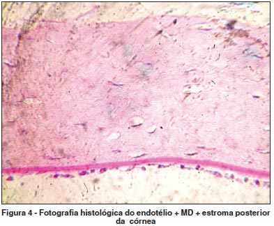O estudo histológico das membranas separadas do grupo 3 demonstrou que aproximadamente 120 µm de espessura estromal permanecia aderida à MD (Figura 4).