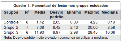 O quadro 1 mostra o porcentual de lesão encontrado nos grupos estudados.