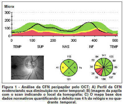 O OCT foi utilizado para medir a camada de fibras nervosas, neste trabalho foi utilizado o Stratus OCT® (Carl Zeiss Meditec, Inc.). O protocolo da rápida CFN 3.4 scan foi utilizado para quantificar a CFN peripapilar (software versão 4.0.1). Um círculo de 3,46 mm de diâmetro constituído de 256 A-scans foi posicionado manualmente no centro do disco óptico. A média, os quadrantes e as horas do relógio da espessura da CFN foram constatatdos na análise após o resultado das médias de três sequências circulares do scan. Todas as imagens escolhidas apresentaram graduação de no mínimo 7. Em relação à classificação normativa foi divida em 4 categorias: 95 a 100% foi considerado hipernormal (cor branca no mapa); 5 a 95% foi normal (verde); 1 a 5% foi boderline (amarelo); e menos que 1% foi considerado anormal (vermelho). Para este estudo branco e verde foram englobadas como normais enquanto amarelo e vermelho foram classificadas como anormais. A análise do OCT pelas horas do relógio foi baseada no olho direito, assim 9 h do scan peripapilar representou o lado temporal do disco óptico de ambos os olhos.