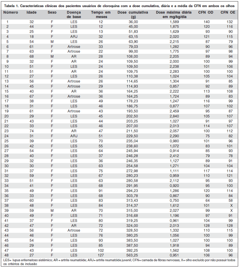 As características clínicas dos usuários de cloroquina e a média da CFN no OD e OE são demonstradas na tabela 1.