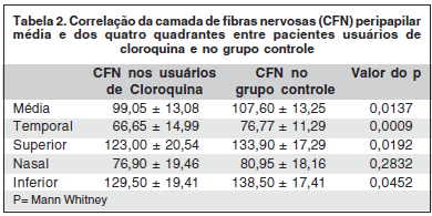 Em relação à média da CFN foi constatado 107,60 ± 13,25 µm no grupo controle e 99,05 ± 13,08 µm nos usuários do medicamento (p=0,0137). Além disso, foi encontrada uma diminuição da CFN estatisticamente significativa entre o grupo controle e os usuários de cloroquina na média nos quadrantes temporal, superior e inferior (Tabela 2).
