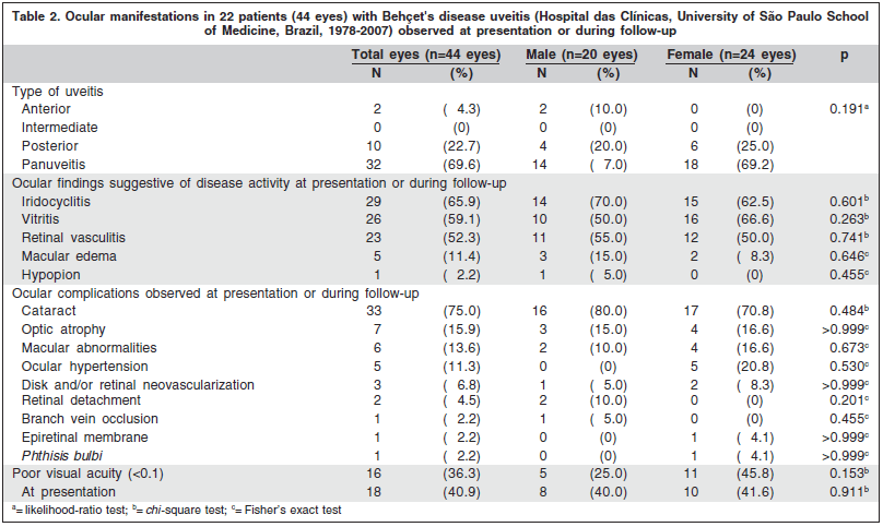 Behçet's disease is a chronic, relapsing, multisystemic idiopathic inflammation characterized by recurrent oral aphthous ulcers, skin lesions, genital ulcers and ocular lesions. It is most prevalent between the second and fourth decades of life. This ubiquitous disorder exhibits a distinct geographic variation and is found predominantly between East Asia and the Mediterranean basin(1). In Brazil it accounts for 3% of uveitis cases(2). The disease is associated with the major histocompatibility complex antigen HLA-B51, mainly in areas along the Silk Road and Japan(3). The frequency of ocular involvement in patients varies between 50-70% in different populations(1). Ocular disease may be the initial manifestation of the disease in approximately onefifth of cases. Although the course of the disease is usually benign in the absence of vital organ involvement, the longterm prognosis for vision is poor if the retina is involved by recurrent obliterative retinal vasculitic attacks. Indeed, it is estimated that 30% of patients loose useful visual acuity (>0.1) in 10 years after the onset of ocular symptoms, this holding true especially regarding Turkish and Japanese patients(4-6).