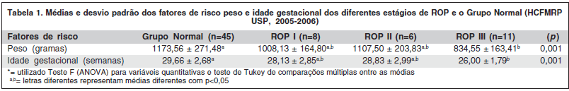 De fato, este estudo mostrou uma associação significativa de baixo peso e pequena idade gestacional com o desenvolvimento de ROP. Vários trabalhos na literatura demonstram que, quanto menor o peso e menor a idade gestacional, maior a chance de desenvolver ROP(13-14, 20-21). O baixo peso e a menor idade gestacional também estão associados com desenvolvimento de formas mais graves de ROP. No presente estudo, o estágio III da doença foi o mais frequente com 15,71% dos casos, se considerados os RN com peso <1.500 g. Esse valor sobe para 23,91% se analisarmos somente recém-nascidos com peso <1.250 g. Esses achados estão de acordo com os encontrados no CRYO-ROP e ETROP, que apresentaram aumento nas formas mais graves de ROP em recém-nascidos com peso menor e mais pré-termos. Analisando a média do peso e da idade gestacional entre os diferentes estágios de ROP, neste estudo, nota-se diferença estatisticamente significante entre o estágio III de ROP e o grupo normal (Teste de Tukey), confirmando a associação inversa entre a imaturidade retiniana e o estágio de ROP.