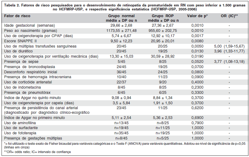 Em estudo retrospectivo realizado no HCFMRP-USP, foram considerados fatores de risco para a ROP: uso de fototerapia, múltiplas transfusões sanguíneas, presença de hemorragia intracraniana e índice de Apgar baixo no primeiro minuto(15).
