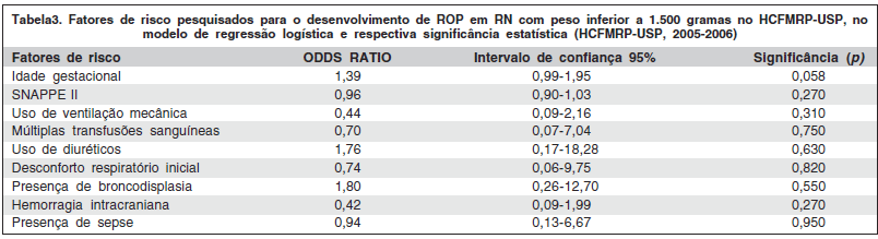 No presente estudo, os seguintes fatores de risco correlacionaram-se significativamente (p<0,05) com o desenvolvimento de ROP: idade gestacional, peso ao nascimento, escore SNAPPE II, uso de oxigenoterapia por pressão positiva de vias aéreas (CPAP), uso de oxigenoterapia por ventilação mecânica em dias, uso de múltiplas transfusões sanguíneas e uso de diurético (Tabela 2). Os demais fatores pesquisados não apresentaram diferença estatisticamente significativa entre os grupos, como demonstrado na tabela 2.