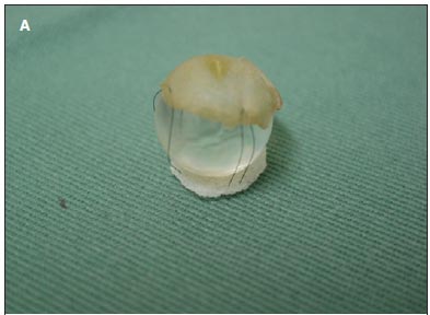 Em 15-07-06 foi realizada nova cirurgia onde foi introduzido um novo modelo de implante. Este novo modelo consiste na utilização de esfera de luxite com posicionamento na face anterior de recorte de dura-máter anexada com fio nylon monofilamentar 6.0 e na face posterior com polietileno poroso fixado com cola (cianoacrilato estéril) (Figura 1A).
