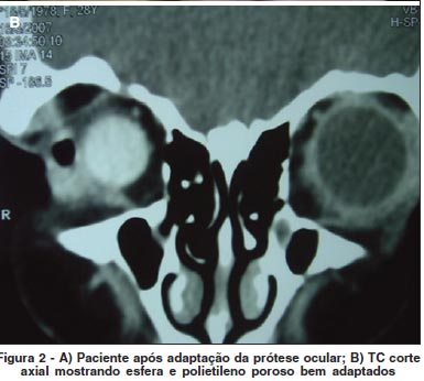 A tomografia computadorizada realizada após 6 meses da cirurgia mostrou implante bem posicionado na órbita, não apresentando nenhum sinal de infecção, migração ou extrusão do implante (Figura 2B).