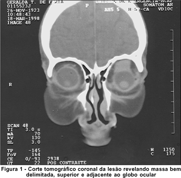 A tomografia de órbita revelou estrutura ovalada, de contornos regulares, medindo 2,0 cm x 1,2 cm, na órbita anterior e superior provocando afinamento do teto orbitário. Após a administração de contraste, notou-se reforço homogêneo da lesão (Figura 1).